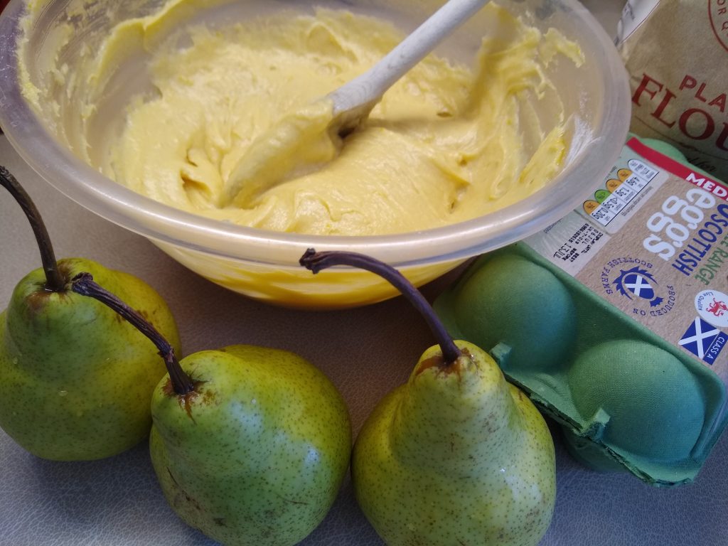 - Chop in chunks half of the pears and add it to the cake mixture.