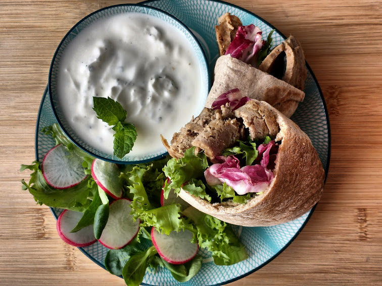 Serve it with warm pita bread, salad and sauces like sour cream or, in this case, mint and yoghurt sauce.